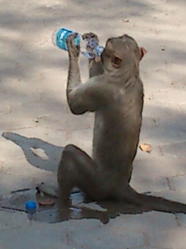My friend was holding a water bottle when suddenly a monkey showed up and started walking towards her. He grabbed the water bottle from her hand, walked some distance away, opened the bottle cap and was drinking water from it LIKE A BOSS ! [See here]